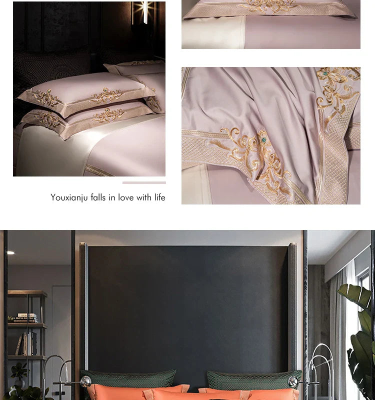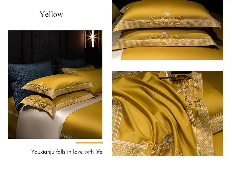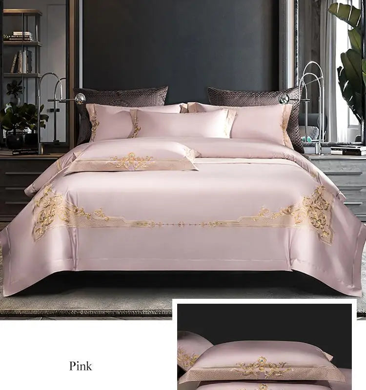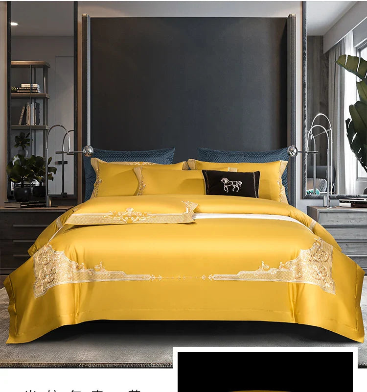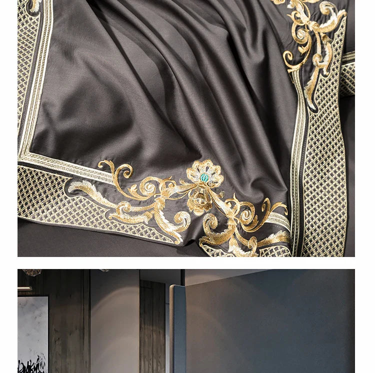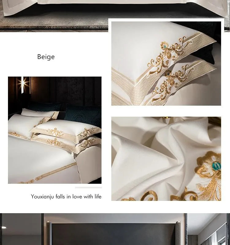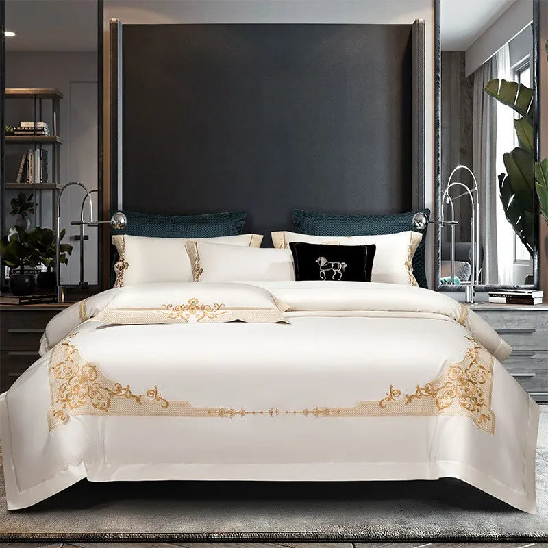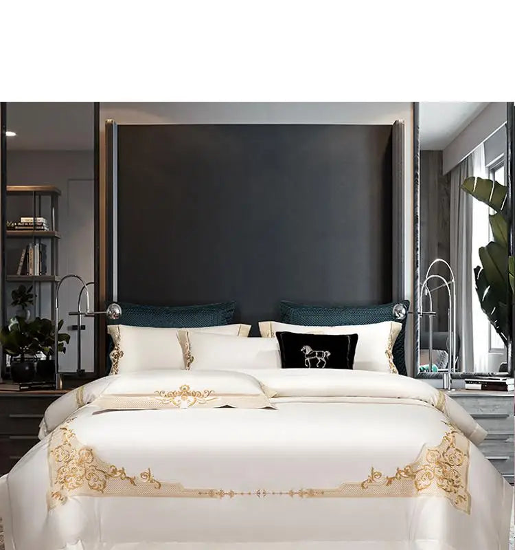 Take luxury from the palace to your bedroom with this Cleopatra luxury duvet cover set. Made from long staple Egyptian cotton, this luxury bedding set is incredibly soft and fluffy, whilst the gold embroidery adds a touch of class to a design that is refreshingly elegant and stylish.